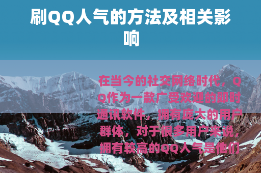 在当今的社交网络时代,QQ作为一款广受欢迎的即时通讯软件,拥有庞大的用户群体,对于很多用户来说,拥有较高的QQ人气是他们所追求的目标之一,刷QQ人气也因此成为了一个备受关注的话题。