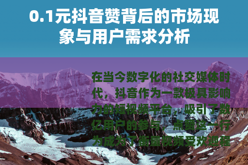 在当今数字化的社交媒体时代,抖音作为一款极具影响力的短视频平台,吸引了数亿用户的参与,点赞这一行为成为了衡量视频受欢迎程度的重要指标之一,而市场上出现的0.1元抖音赞的现象,也引发了广泛的关注和讨论。