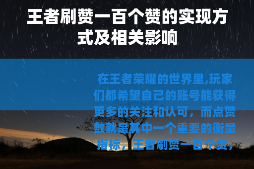在王者荣耀的世界里,玩家们都希望自己的账号能获得更多的关注和认可,而点赞数就是其中一个重要的衡量指标,王者刷赞一百个赞,对于许多玩家来说,是一个具有一定吸引力的目标。