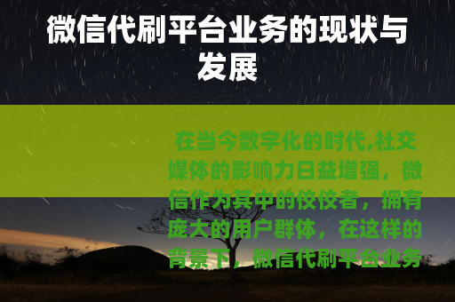 在当今数字化的时代,社交媒体的影响力日益增强,微信作为其中的佼佼者,拥有庞大的用户群体,在这样的背景下,微信代刷平台业务逐渐兴起并引起了人们的关注。