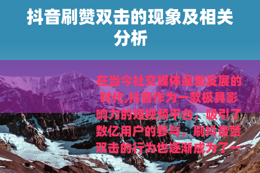 在当今社交媒体蓬勃发展的时代,抖音作为一款极具影响力的短视频平台,吸引了数亿用户的参与,刷抖音赞双击的行为也逐渐成为了一个备受关注的话题。