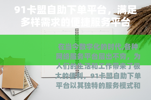 在当今数字化的时代,各种网络服务平台层出不穷,为人们的生活和工作带来了极大的便利,91卡盟自助下单平台以其独特的服务模式和丰富的业务种类,在众多平台中脱颖而出,成为了许多用户的首选。