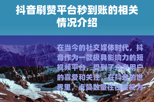在当今的社交媒体时代,抖音作为一款极具影响力的短视频平台,受到了众多用户的喜爱和关注,在抖音的世界里,点赞数量往往被视为衡量一个视频受欢迎程度的重要指标之一,便出现了所谓的抖音刷赞平台秒到账这样的服务。