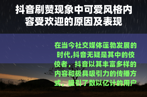 在当今社交媒体蓬勃发展的时代,抖音无疑是其中的佼佼者,抖音以其丰富多样的内容和极具吸引力的传播方式,吸引了数以亿计的用户,刷赞行为虽然在一定程度上存在争议,但不可否认的是,可爱风格的内容在抖音刷赞中占据了重要的一席之地。