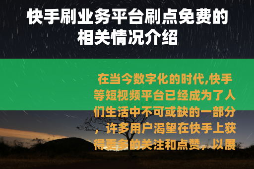 在当今数字化的时代,快手等短视频平台已经成为了人们生活中不可或缺的一部分,许多用户渴望在快手上获得更多的关注和点赞,以展示自己的才华或推广自己的产品和服务,在这样的背景下,快手刷业务平台刷点免费的现象逐渐进入了人们的视野。