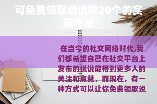 在当今的社交网络时代,我们都希望自己在社交平台上发布的说说能得到更多人的关注和点赞,而现在,有一种方式可以让你免费领取说说赞20个,为你的社交生活增添更多的乐趣和光彩。
