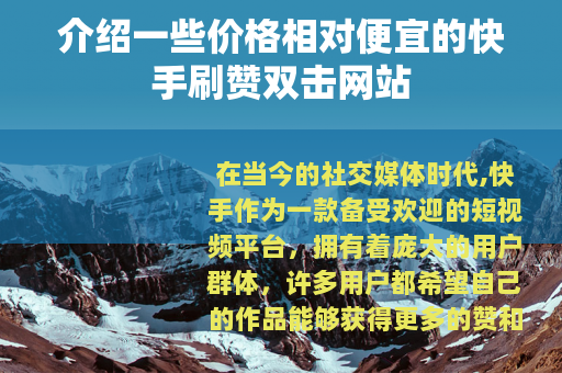 在当今的社交媒体时代,快手作为一款备受欢迎的短视频平台,拥有着庞大的用户群体,许多用户都希望自己的作品能够获得更多的赞和双击,从而提高作品的曝光度和人气,在这种需求下,出现了一些声称可以提供快手刷赞双击服务的网站,其中不乏价格相对便宜的选择。