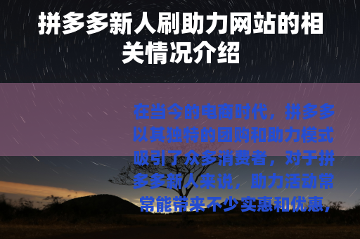 在当今的电商时代,拼多多以其独特的团购和助力模式吸引了众多消费者,对于拼多多新人来说,助力活动常常能带来不少实惠和优惠,而拼多多新人刷助力网站也随之应运而生。