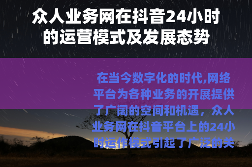 在当今数字化的时代,网络平台为各种业务的开展提供了广阔的空间和机遇,众人业务网在抖音平台上的24小时运作模式引起了广泛的关注。