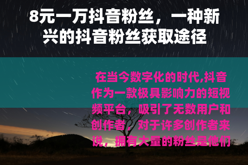 在当今数字化的时代,抖音作为一款极具影响力的短视频平台,吸引了无数用户和创作者,对于许多创作者来说,拥有大量的粉丝是他们在平台上取得成功的关键之一,而在这个需求的推动下,一种价格为8元一万抖音粉丝的现象逐渐出现在大众视野中。
