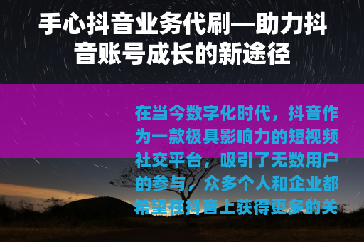 在当今数字化时代,抖音作为一款极具影响力的短视频社交平台,吸引了无数用户的参与,众多个人和企业都希望在抖音上获得更多的关注和流量,从而实现自身的价值和目标,而手心抖音业务代刷,便在这样的背景下应运而生,为抖音用户提供了一种新的发展途径。