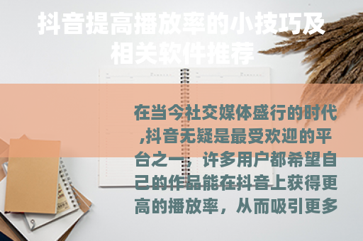 在当今社交媒体盛行的时代,抖音无疑是最受欢迎的平台之一,许多用户都希望自己的作品能在抖音上获得更高的播放率,从而吸引更多的关注和粉丝,抖音提高播放率的小技巧有哪些呢?又有哪些软件可以助力呢? 创作是关键,要确保你的视频内容具有吸引力和独特性,可以从热门话题入手,结合自己的风格和特长,制作出有趣、有用或有情感共鸣的视频,如果你擅长烹饪,那么可以制作精美的美食制作教程,详细展示每一个步骤和独特的烹饪技巧,让观众在观看后能有所收获,这样的视频往往更容易受到欢迎。