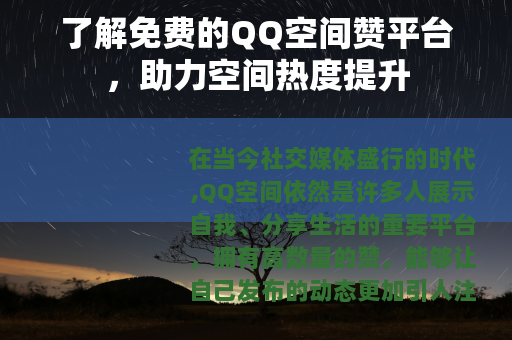 在当今社交媒体盛行的时代,QQ空间依然是许多人展示自我、分享生活的重要平台,拥有高数量的赞,能够让自己发布的动态更加引人注目,也能在一定程度上满足人们的社交心理需求,而免费的QQ空间赞平台,便在这样的背景下应运而生,为广大用户提供了一种增加空间人气的途径。