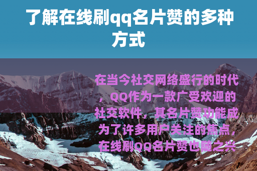 在当今社交网络盛行的时代,QQ作为一款广受欢迎的社交软件,其名片赞功能成为了许多用户关注的焦点,在线刷QQ名片赞也随之兴起,为用户提供了一种快速增加名片赞数量的途径。