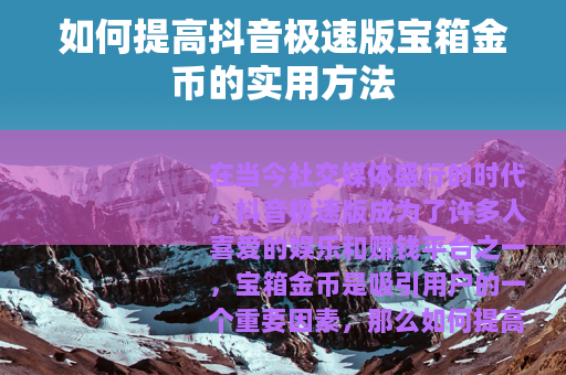 在当今社交媒体盛行的时代,抖音极速版成为了许多人喜爱的娱乐和赚钱平台之一,宝箱金币是吸引用户的一个重要因素,那么如何提高抖音极速版宝箱金币呢?以下是一些实用的方法。
