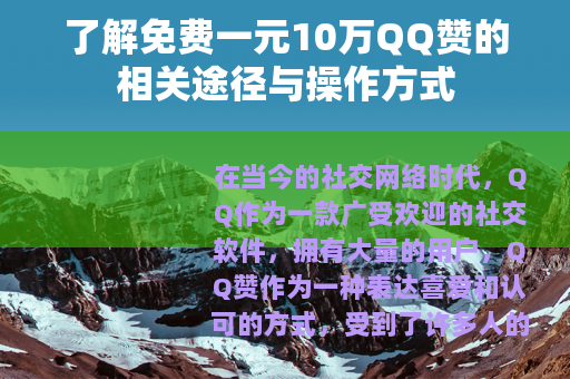 在当今的社交网络时代,QQ作为一款广受欢迎的社交软件,拥有大量的用户,QQ赞作为一种表达喜爱和认可的方式,受到了许多人的关注,而免费一元10万QQ赞这样的信息,也在网络上悄然流传。