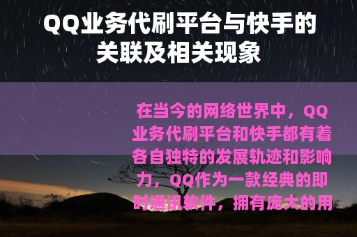 在当今的网络世界中,QQ业务代刷平台和快手都有着各自独特的发展轨迹和影响力,QQ作为一款经典的即时通讯软件,拥有庞大的用户群体,而与之相关的QQ业务代刷平台也随之兴起,这些平台声称可以为用户提供各种QQ业务的代刷服务,如QQ等级加速、QQ空间人气提升、QQ会员黄钻等业务的快速开通等。