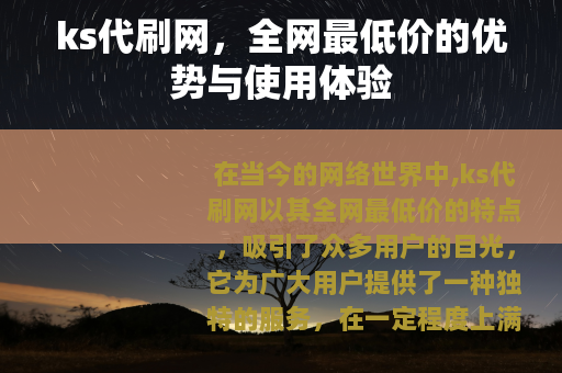 在当今的网络世界中,ks代刷网以其全网最低价的特点,吸引了众多用户的目光,它为广大用户提供了一种独特的服务,在一定程度上满足了人们对于数据增长等方面的需求。