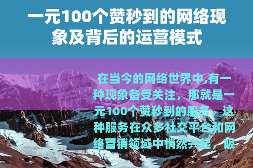 在当今的网络世界中,有一种现象备受关注,那就是一元100个赞秒到的服务,这种服务在众多社交平台和网络营销领域中悄然兴起,吸引了不少人的目光。
