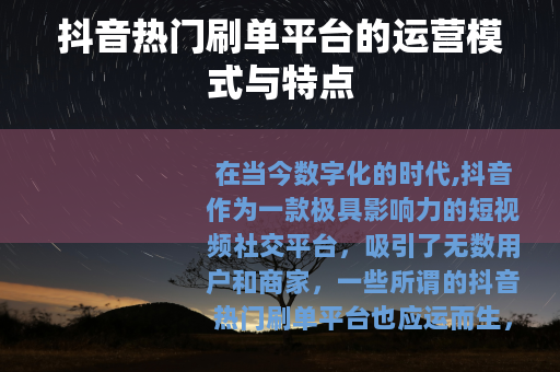 在当今数字化的时代,抖音作为一款极具影响力的短视频社交平台,吸引了无数用户和商家,一些所谓的抖音热门刷单平台也应运而生。