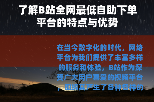 B站全网最低自助下单平台在当前的网络环境下具有重要的地位和作用,它为用户提供了便利和机会,为平台的发展注入了新的活力,我们应该以理性和客观的态度看待它,充分发挥其优势,同时也要注意解决可能出现的问题,共同促进其健康、可持续的发展,为B站以及整个互联网内容创作领域带来更多的价值和意义。