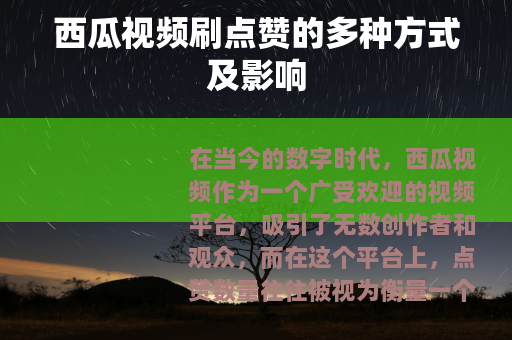 我们可以看到,西瓜视频刷点赞在一定程度上反映了创作者们对作品热度和关注度的渴望,但它并不是提升作品影响力的长久之计,只有通过不断努力提高作品的质量,积极与观众互动,才能在西瓜视频这个充满机遇的平台上真正获得成功,无论是创作者还是平台方,都需要共同努力,在追求发展的同时,保持平台的公平性和健康性,让西瓜视频成为一个更加优质、多元的视频创作和分享平台,为广大用户带来更多有价值、有意义的内容和体验。