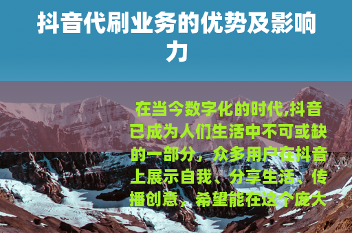 在当今数字化的时代,抖音已成为人们生活中不可或缺的一部分,众多用户在抖音上展示自我、分享生活、传播创意,希望能在这个庞大的平台上获得更多的关注和认可,而在这个过程中,抖音代刷业务逐渐兴起,并展现出其独特的优势,堪称最牛。