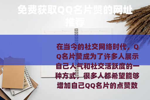 在当今的社交网络时代,QQ名片赞成为了许多人展示自己人气和社交活跃度的一种方式,很多人都希望能够增加自己QQ名片的点赞数量,让自己在好友列表中更加突出,而如今,网络上出现了一些声称可以提供免费QQ刷名片赞的网址,为广大QQ用户带来了新的途径。