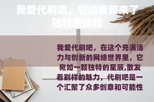 我爱代刷吧,它为我的网络生活增添了许多色彩和乐趣,它让我在虚拟的世界中实现了自己的梦想和目标,让我感受到了科技和创新带来的无限可能,我相信,在未来的日子里,代刷吧会不断发展壮大,为更多的用户带来更好的服务和体验,成为网络世界中不可或缺的一部分。 对您有所帮助,您可以根据实际需求进行调整和修改,需要注意的是,代刷等行为可能存在违反法律法规和平台规定的风险,以上内容仅为按照您的要求创作的示例,不构成对代刷行为的鼓励或支持。