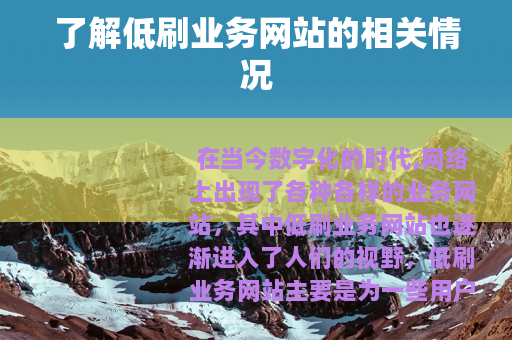 在当今数字化的时代,网络上出现了各种各样的业务网站,其中低刷业务网站也逐渐进入了人们的视野,低刷业务网站主要是为一些用户提供特定数据或业务量的提升服务。