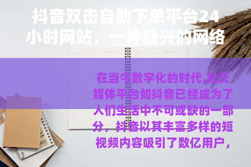 在当今数字化的时代,社交媒体平台如抖音已经成为了人们生活中不可或缺的一部分,抖音以其丰富多样的短视频内容吸引了数亿用户,而在这个庞大的用户群体中,一种名为抖音双击自助下单平台24小时网站的服务也悄然兴起。