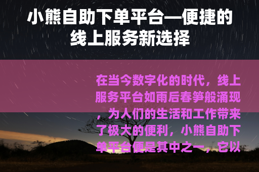在当今数字化的时代,线上服务平台如雨后春笋般涌现,为人们的生活和工作带来了极大的便利,小熊自助下单平台便是其中之一,它以独特的优势在众多平台中脱颖而出,成为了许多用户的青睐之选。