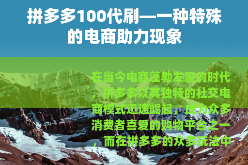 在当今电商蓬勃发展的时代,拼多多以其独特的社交电商模式迅速崛起,成为众多消费者喜爱的购物平台之一,而在拼多多的众多玩法中,有一种现象引起了不少人的关注,那就是拼多多100代刷。