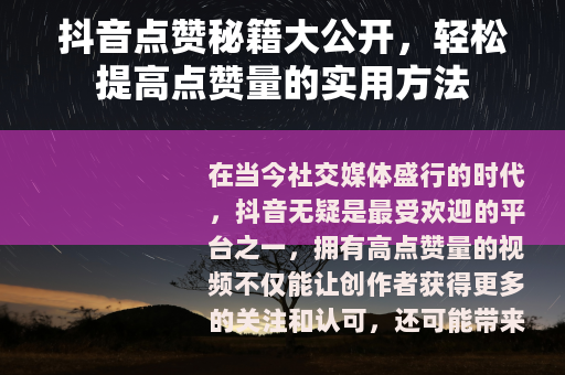 在当今社交媒体盛行的时代,抖音无疑是最受欢迎的平台之一,拥有高点赞量的视频不仅能让创作者获得更多的关注和认可,还可能带来意想不到的流量和收益,怎么提高抖音点赞方法呢?下面就为大家详细介绍一些实用的技巧。