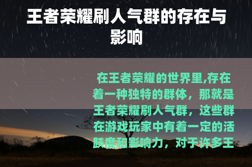在王者荣耀的世界里,存在着一种独特的群体,那就是王者荣耀刷人气群,这些群在游戏玩家中有着一定的活跃度和影响力。