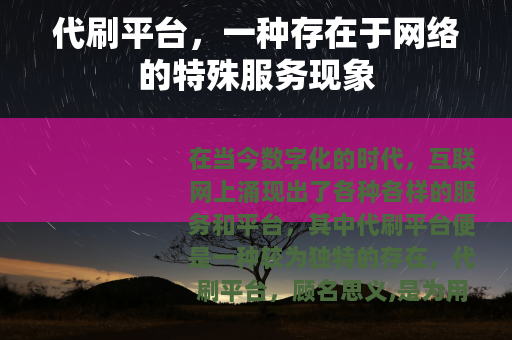 在当今数字化的时代,互联网上涌现出了各种各样的服务和平台,其中代刷平台便是一种较为独特的存在,代刷平台,顾名思义,是为用户提供各类数据代刷服务的网络平台。