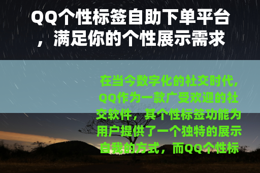 在当今数字化的社交时代,QQ作为一款广受欢迎的社交软件,其个性标签功能为用户提供了一个独特的展示自我的方式,而QQ个性标签自助下单平台的出现,更是为广大用户带来了更多的便利和选择。
