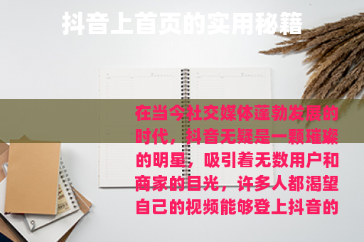 在当今社交媒体蓬勃发展的时代,抖音无疑是一颗璀璨的明星,吸引着无数用户和商家的目光,许多人都渴望自己的视频能够登上抖音的首页,从而获得巨大的流量和曝光,怎样才能实现抖音上首页这个目标呢? 质量是关键,要制作出具有吸引力和独特性的视频内容,了解你的目标受众,知道他们的兴趣和需求,然后根据这些来创作视频,如果你的受众是年轻人,那么可以采用时尚、潮流、娱乐等元素来吸引他们,确保视频的画面清晰、稳定,声音清晰可听,这样才能给用户带来良好的观看体验。