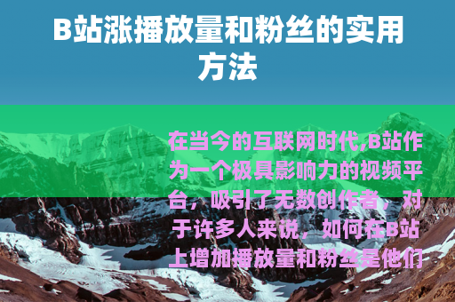 在当今的互联网时代,B站作为一个极具影响力的视频平台,吸引了无数创作者,对于许多人来说,如何在B站上增加播放量和粉丝是他们非常关心的问题,以下是一些有效的方法可以帮助你在B站实现这一目标。 质量是关键,你需要制作出有价值、有趣且独特的视频内容,深入了解你的目标受众,知道他们感兴趣的话题和喜好,然后根据这些来策划和创作视频,如果你面向的是年轻的游戏玩家群体,那么制作精彩的游戏攻略、搞笑的游戏实况解说或者新颖的游戏评测等视频,会更容易吸引他们的关注,要注重视频的制作水平,包括画面的清晰度、声音的质量以及剪辑的流畅性等,一个高质量的视频会给观众留下更好的印象,从而增加他们分享和推荐的可能性。