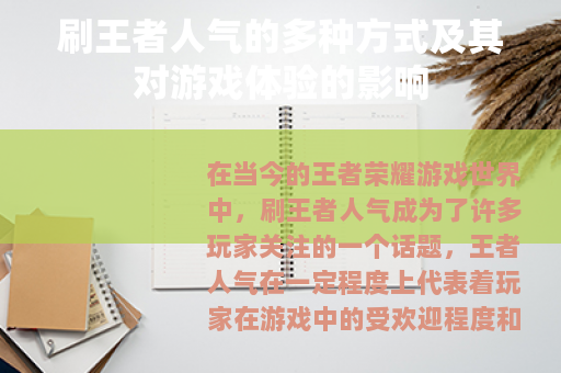 还有一些玩家会通过制作优质的游戏攻略或视频来刷王者人气,他们会花费大量的时间和精力去研究游戏中的英雄技能、装备搭配以及各种地图的打法等,然后将这些内容整理成详细的攻略,发布在游戏论坛或视频平台上,这些攻略和视频如果能够帮助其他玩家提高游戏水平,就会得到众多玩家的点赞、评论和转发,从而为作者带来大量的人气,这种方式不仅能够提升自己在游戏中的知名度,还能为整个游戏社区的发展做出贡献,让更多的玩家感受到游戏的乐趣和深度。