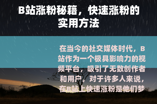 在当今的社交媒体时代,B站作为一个极具影响力的视频平台,吸引了无数创作者和用户,对于许多人来说,在B站上快速涨粉是他们梦寐以求的目标,B站涨粉怎么样才能涨粉快呢?以下是一些实用的方法。 质量是关键,要制作出高质量、有吸引力的视频内容,这意味着你需要有独特的创意和观点,能够在众多视频中脱颖而出,深入了解你的目标受众,知道他们感兴趣的话题和需求,然后围绕这些来创作内容,如果你发现游戏攻略类视频很受欢迎,而你又擅长某款游戏,那么就可以制作详细且实用的游戏攻略视频,为玩家提供真正有价值的帮助。