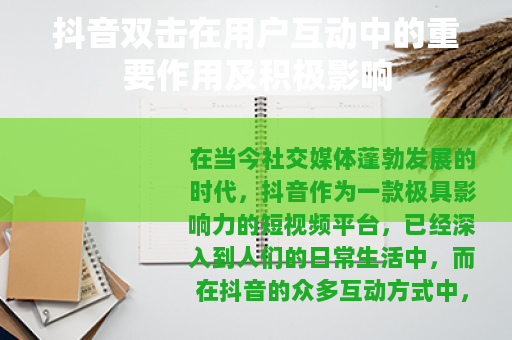 在当今社交媒体蓬勃发展的时代,抖音作为一款极具影响力的短视频平台,已经深入到人们的日常生活中,而在抖音的众多互动方式中,双击这一操作有着独特的意义和价值,它为用户带来了丰富的体验,也在平台的生态构建中发挥着重要作用。