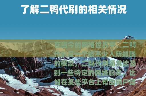 在当今的网络世界中,二鸭代刷是一个被不少人所知晓的概念,二鸭代刷通常涉及到一些特定的网络服务,比如在某些平台上帮助用户增加粉丝数量、点赞量、评论量等数据。