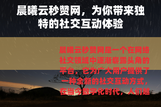 晨曦云秒赞网是一个在网络社交领域中逐渐崭露头角的平台,它为广大用户提供了一种全新的社交互动方式,在当今数字化时代,人们越来越依赖网络社交来与朋友、家人和同事保持联系,同时也渴望在虚拟世界中获得更多的关注和认可,晨曦云秒赞网正是迎合了这一需求,为用户创造了一个充满活力和乐趣的社交空间。