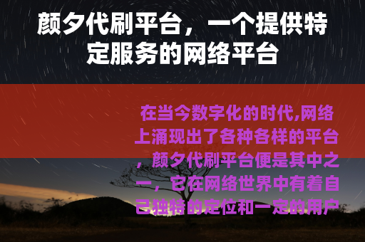 颜夕代刷平台在网络世界中有着自己的一席之地,它既为用户提供了一定的便利和机会,也面临着诸多的挑战和发展需求,在未来的发展中,它需要不断努力,与时俱进,与用户共同成长,为网络生态的繁荣和发展做出自己的贡献。