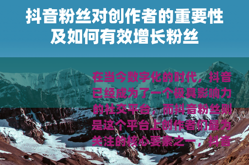 抖音粉丝对于创作者来说具有极其重要的意义,他们是创作者内容传播的有力推动者,是创作动力的重要源泉,也是衡量创作者在平台上影响力的重要指标之一,通过不断提升内容质量、保持稳定更新、加强与粉丝的互动以及充分利用抖音的各种功能,创作者们能够有效地增长自己的抖音粉丝,从而在这个充满机遇的平台上实现自己的创作梦想,打造出具有广泛影响力的个人品牌。