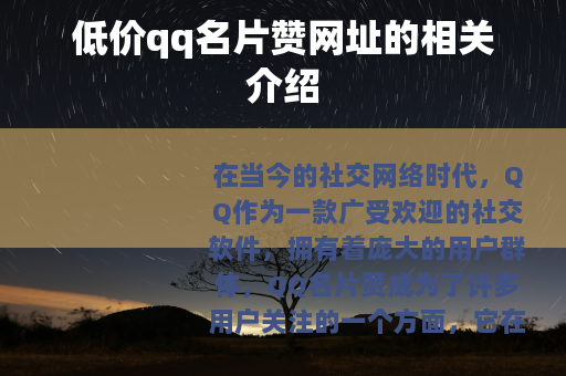 对于一些QQ用户来说,低价QQ名片赞网址不仅仅是一种增加名片赞的工具,更是一种社交助力,在QQ的各种社交场景中,如QQ空间、QQ群聊等,较高的名片赞数量可以让用户在展示自己的个性和魅力方面更具优势,比如在QQ空间中发布一条动态,拥有大量名片赞的用户的动态可能会更容易被其他好友看到和关注,从而引发更多的互动和交流,在QQ群聊中,名片赞数量高的用户也可能会被其他群成员认为是比较活跃和受欢迎的,进而更容易融入群聊氛围,结交更多的朋友。