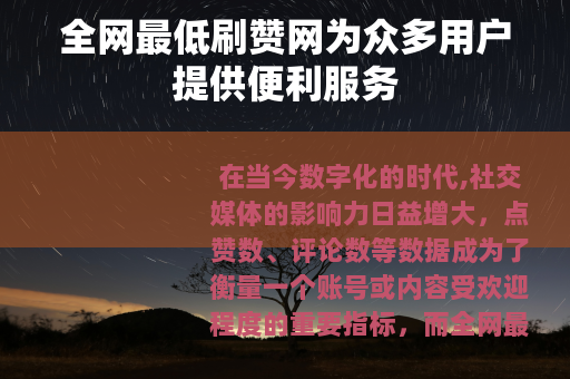 在当今数字化的时代,社交媒体的影响力日益增大,点赞数、评论数等数据成为了衡量一个账号或内容受欢迎程度的重要指标,而全网最低刷赞网的出现,为许多有需求的用户带来了新的机会和便利。