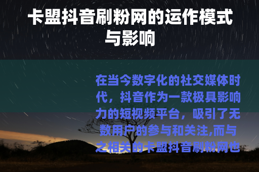 在当今数字化的社交媒体时代,抖音作为一款极具影响力的短视频平台,吸引了无数用户的参与和关注,而与之相关的卡盟抖音刷粉网也逐渐进入了人们的视野。