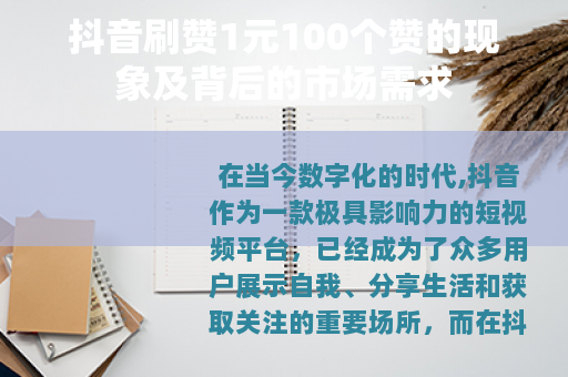 在当今数字化的时代,抖音作为一款极具影响力的短视频平台,已经成为了众多用户展示自我、分享生活和获取关注的重要场所,而在抖音的生态中,点赞数量往往被视为衡量一个视频受欢迎程度的重要指标之一,一种“抖音刷赞1元100个赞”的服务悄然兴起,引发了广泛的关注和讨论。